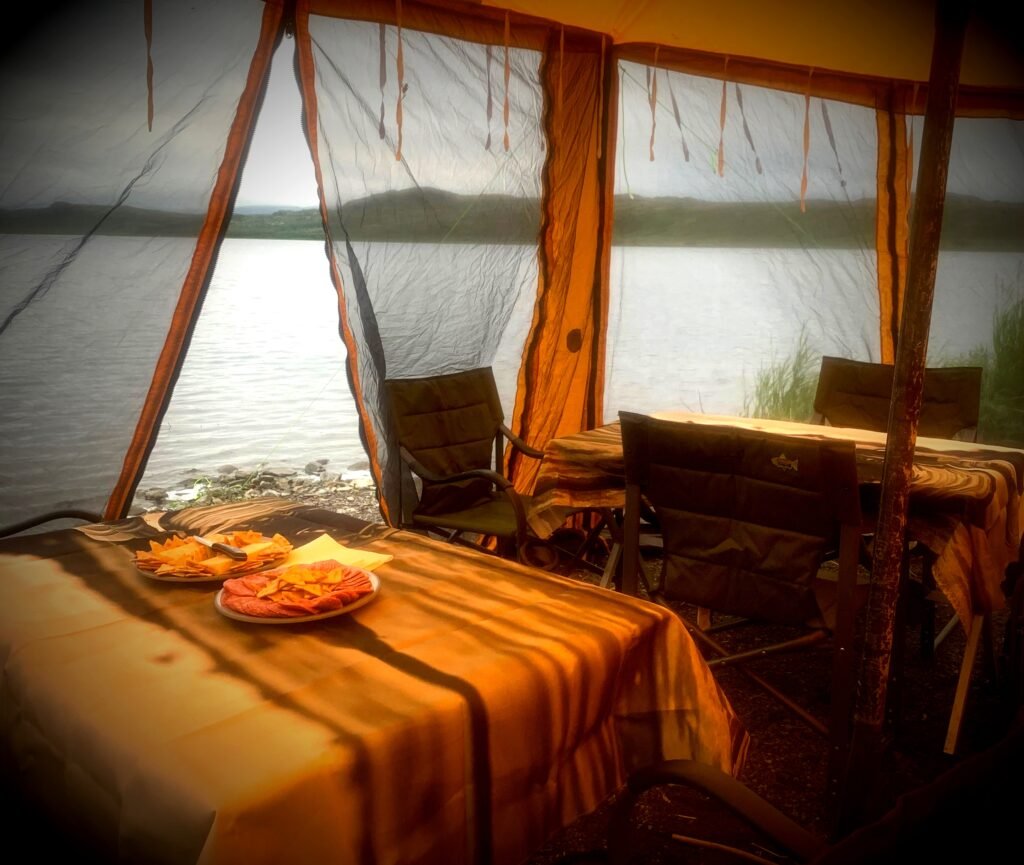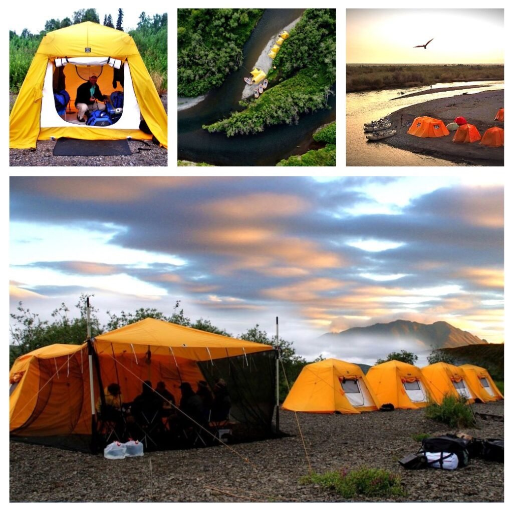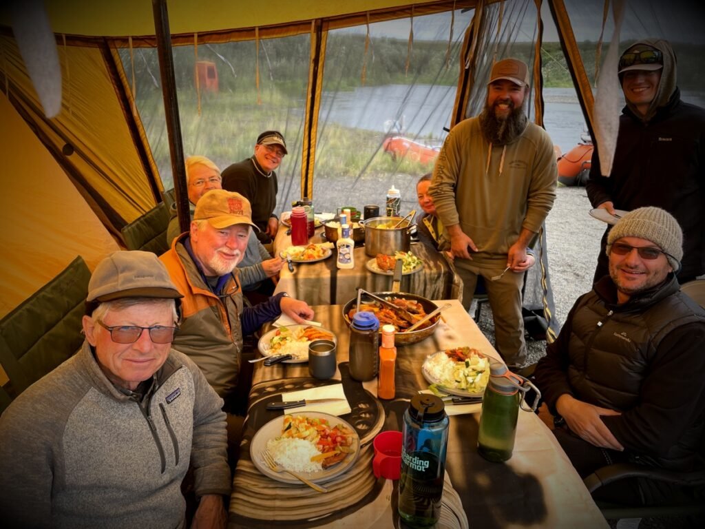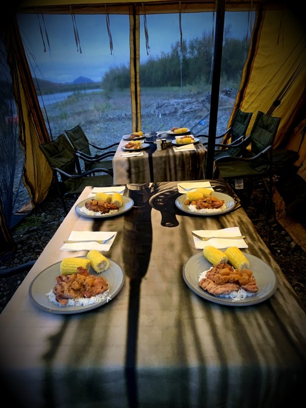 - Dining tent and screened area: Our “Alaska Lodge Style Float Trips” feature a custom-built dining tent and screened area (which can also be enclosed) and is large enough to accommodate the entire group. This provides a comfortable space for meals and socializing, especially during inclement weather or when insects are prevalent.