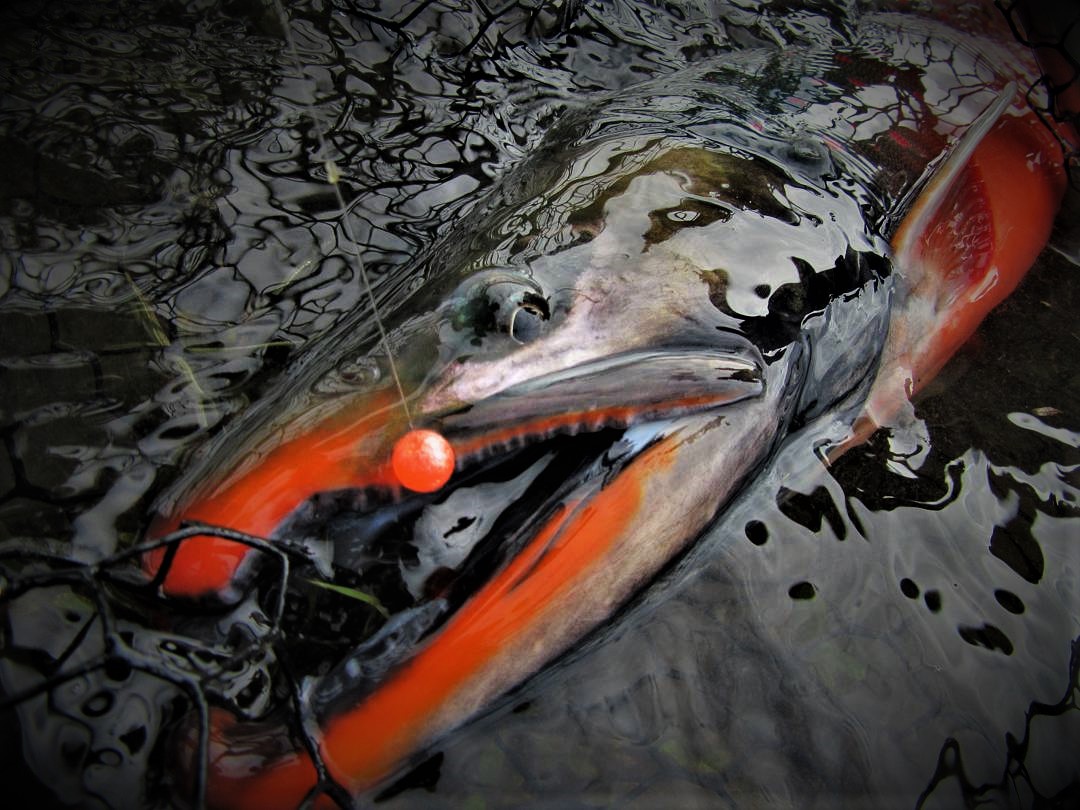 September is full fall mode. Males develop kypes, bellies turn deep orange, and flesh becomes a major food source as salmon break down. Beads bump up to 8–10mm and mottled colors start to matter. This is the best mix of color, size, and attitude — and a big part of why fall trips book early.