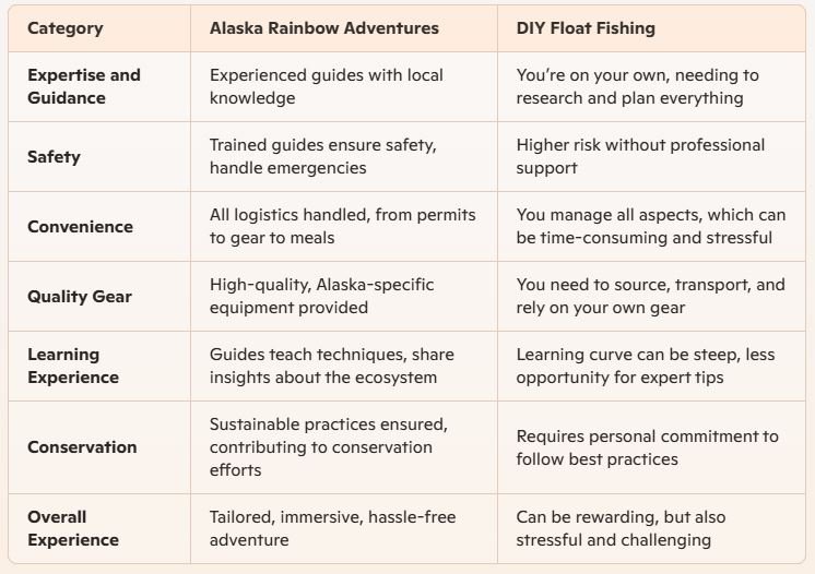 Planning an Alaska float fishing trip can be the adventure of a lifetime. Yet, one of the key decisions you’ll face is whether to go it alone or enlist the expertise of the seasoned guides here at Alaska Rainbow Adventures.